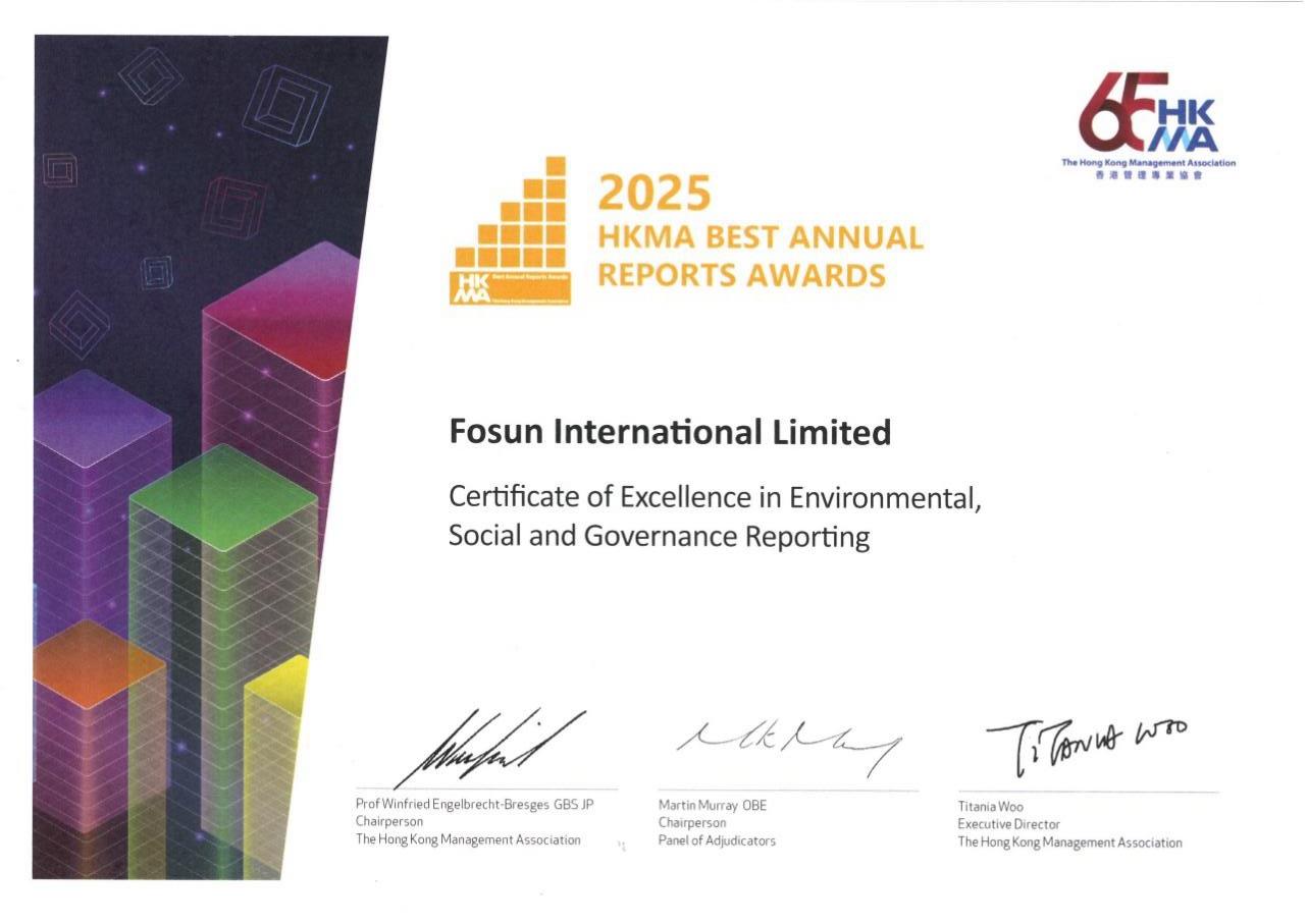 2026年2月23日,香港管理专业协会(HKMA)在香港举办“2025年度最佳年报大奖”颁奖典礼。复星国际荣获“环境、社会及管治报告卓越奖”(Certificate of Excellence in Environmental, Social and Governance Reporting),彰显公司在ESG策略、环境保护、社会责任、企业治理及信息披露等方面的优异表现持续获得业内专业权威机构的高度认可。